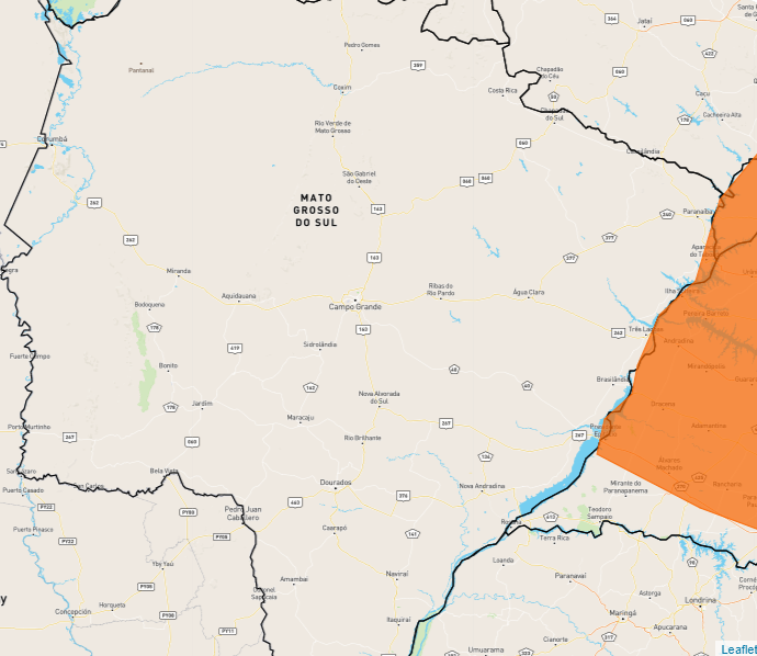 O alerta laranja de tempestade, que indica perigo, abrange sete municípios sul-mato-grossenses da região leste (Aparecida do Taboado, Bataguassu, Brasilândia, Paranaíba, Santa Rita do Pardo, Selvíria e Três Lagoas).