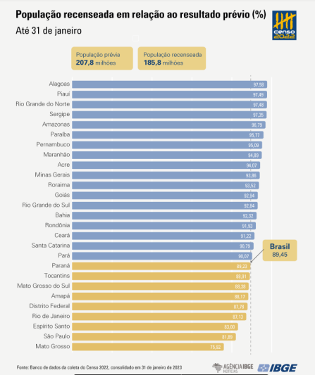 Até 31 de janeiro, foram recenseadas 2.504.514, o que representa 89,3% da população total do Estado. A taxa média de recusas é de 1,74%, abaixo da média nacional que é de 2,43%. Já a média de morador ausente, chamada de recusa velada, é de 5,78%, acima no nível nacional que é de 4,62%. A previsão é que os dados concluídos sejam divulgados no mês de abril.
