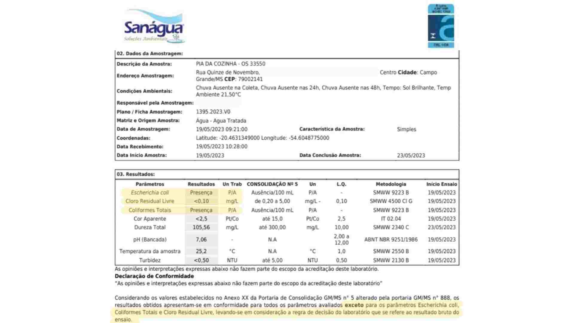 Laudo da Sanágua, que é uma empresa especializada em tratamento de água, apontou a presença de coliformes e a bactéria Escherichia Coli (E. Coli). A reportagem conversou com o técnico que emitiu o laudo e ele atestou a seriedade do procedimento. “Existe uma contaminação e agora é necessário ver o caminho desta água”, afirmou o técnico Fabiano Storti, de 52 anos.