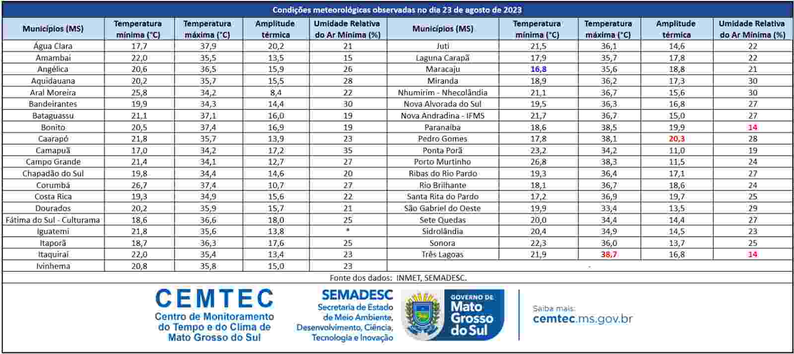 Segundo o Cemtec (Centro de Monitoramento do Tempo e do Clima), Paranaíba e Três Lagoas lideraram com a menor umidade do Estado. Em seguida está Amambai (15%), Nova Andradina (15%), Nhecolândia (15,6%) e Nova Alvorada do Sul (16,8%).