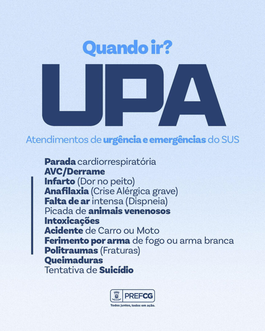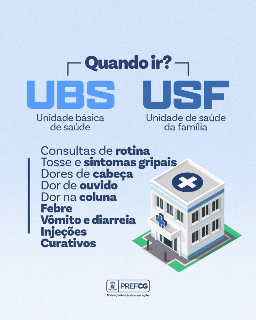 Na hora de procurar atendimento médico é comum surgir a dúvida de qual unidade de saúde procurar. Para ajudar e evitar eventuais transtornos, a Prefeitura de Campo Grande divulgou material onde explica a diferença dos atendimentos nas UPAs (Unidade de Pronto Atendimento), UBSs (Unidade Básica de Saúde) e USFs (Unidade de Saúde da Família). Campo Grande enfrenta surto de doenças respiratórias e aumento de até 30% na demanda de atendimentos.