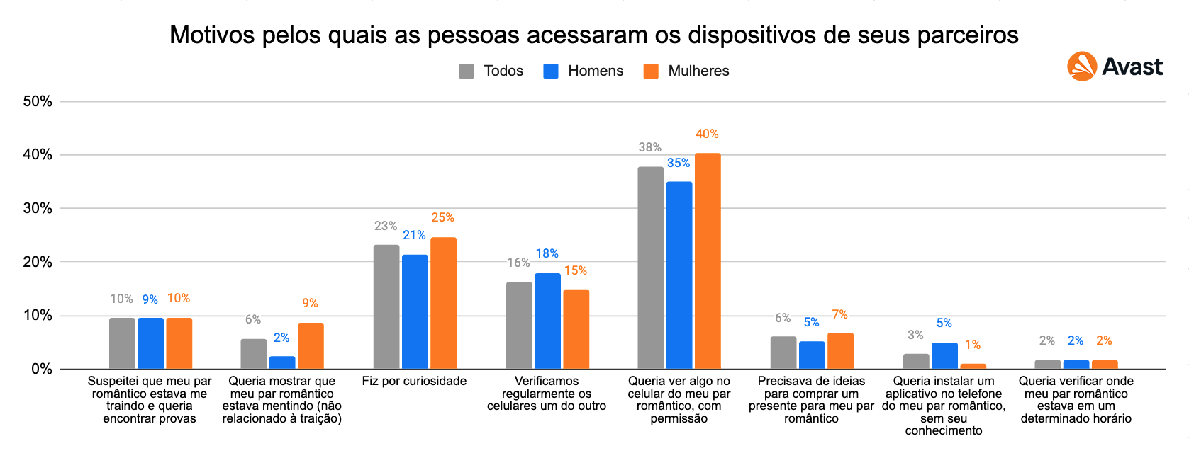 A pesquisa da Avast também indica que 69% dos brasileiros que verificaram o telefone do parceiro admitem que não têm direito de acessar o dispositivo sem permissão.