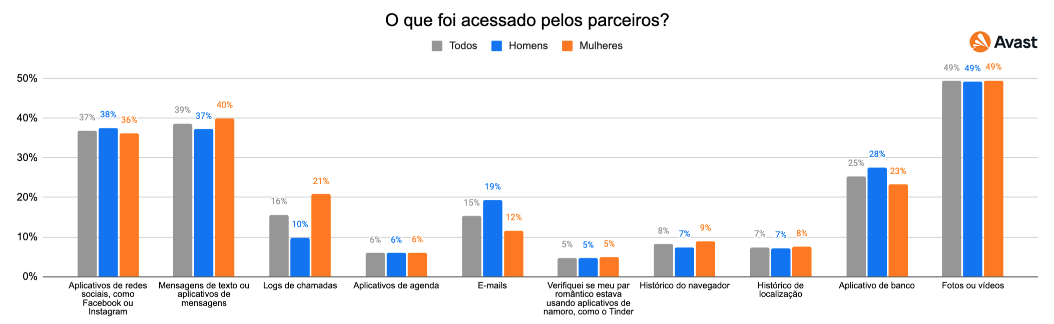A pesquisa da Avast indica que as galerias de fotos e vídeos foram os mais acessados (49%), seguidos por aplicativos de mensagens de texto ou apps de mensagens similares (39%), e por aplicativos de redes sociais como Facebook ou Instagram (37%).