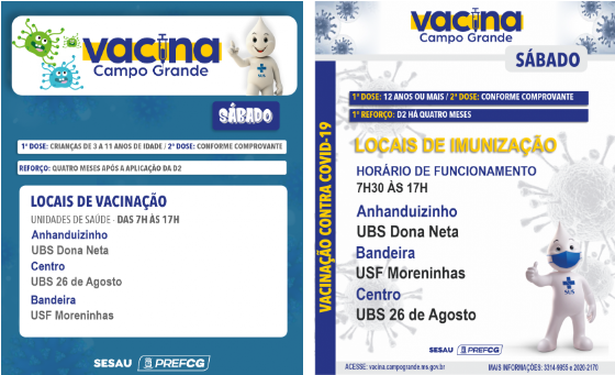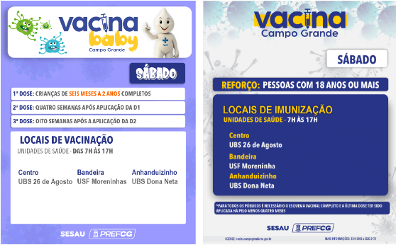 A vacinação contra covid-19 e gripe continua em Campo Grande, com escala de plantão em três unidades de saúde neste sábado (3) e serviço itinerante. Doses estão disponíveis para todos os públicos, de bebês a partir dos seis meses a idosos com mais de 60 anos.