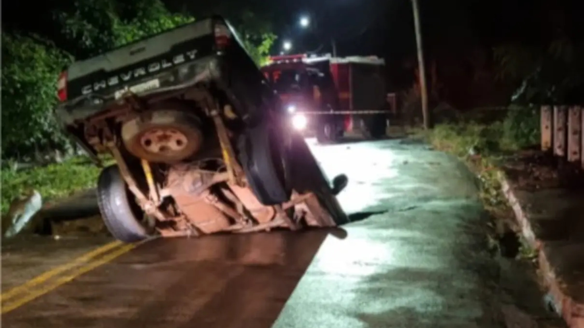 A família com quatro adultos seguia pela via quando a caminhonete S-10 ficou com a parte dianteira presa na cratera. Todos os passageiros conseguiram sair do veículo e ninguém ficou ferido.