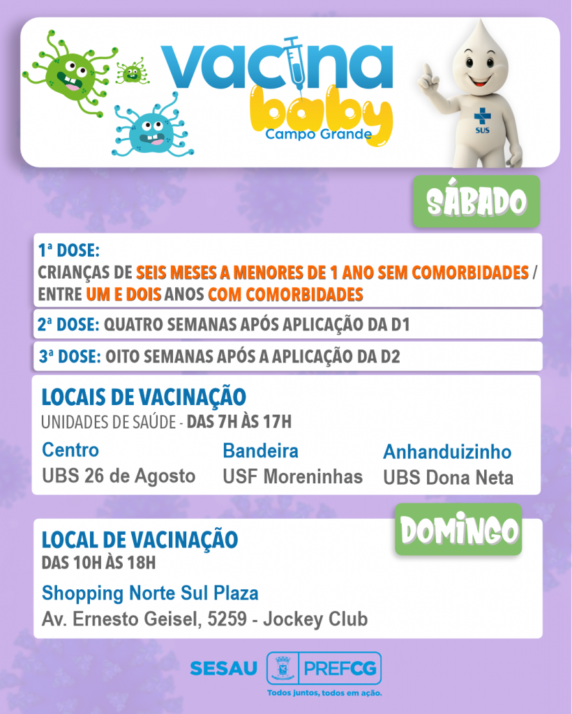 Conforme cronograma de plantão, a vacina para crianças está disponibilizado para 1ª dose em bebês de seis meses a menores de um ano e sem comorbidade, e entre um e dois anos com comorbidades. A 2ª dose para crianças que aplicaram a D1 há quatro semanas, e a 3ª dose após oito semanas da aplicação da D2. Também para o público infantil, está disponível a primeira dose crianças com três anos ou mais e a 2ª dose de acordo com o comprovante.