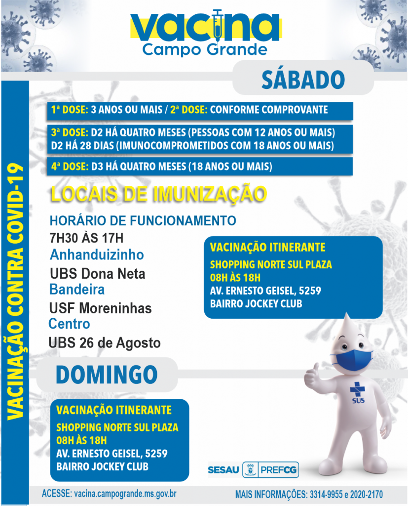 A vacinação contra Covid-19 terá horário especial neste sábado (28) em quatro pontos de imunização em Campo Grande. Conforme a Sesau, o atendimento acontece das 7h às 17h.