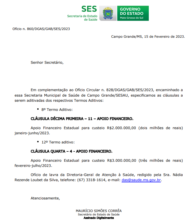 Segundo informações apuradas pela reportagem, a Santa Casa negociou a prorrogação do contrato de custeio em 2022 e o Governo de Mato Grosso do Sul se comprometeu em repassar R$ 5 milhões a fim de minimizar o déficit do hospital, que é mais de R$ 12 milhões. Com isso, o acréscimo no repasse foi formalizado em R$ 2 milhões pelo 8º Termo Aditivo e mais R$ 3 milhões pelo 12º.
