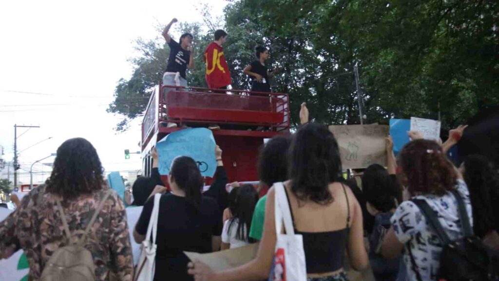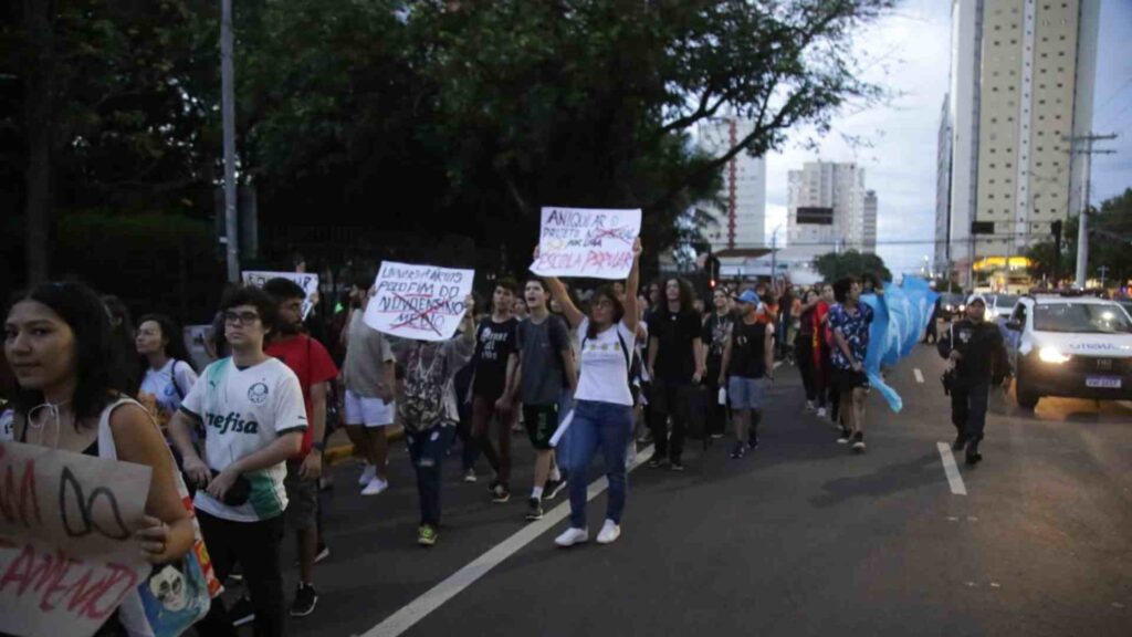 Manifestação pedindo o fim do novo ensino médio uniu professores e estudantes, no fim da tarde desta quarta-feira (15), no Centro de Campo Grande. O grupo saiu da Praça do Rádio e seguiu pela Afonso Pena até a Praça Ary Coelho. O movimento foi acompanhado pela Agetran (Agência Municipal de Transporte e Trânsito) e Guarda Municipal.