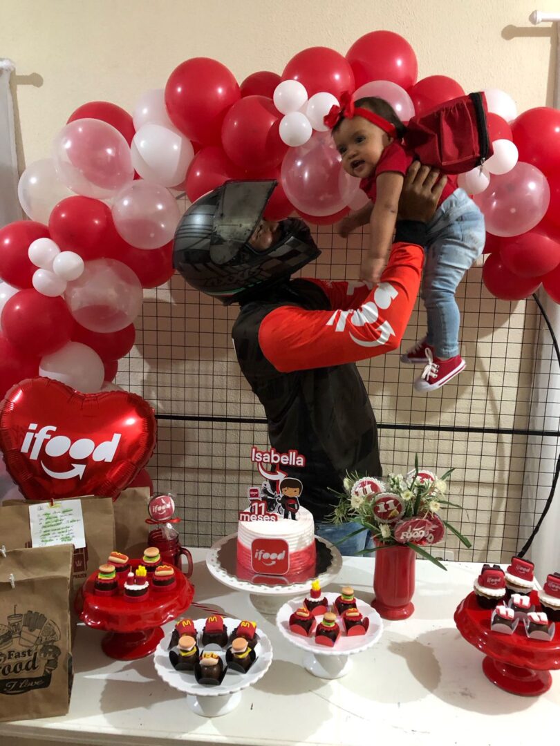 “A ideia da festa foi homenagear o esforço e dedicação dele à profissão. Sempre que o pai chegava ela queria subir na moto, às vezes só de ouvir o barulho. Quando fez um aninho ela pegava a mini mochila de entregador e colocava igual ao pai. Todo dia faziam uma ligação por vídeo para ela ver ele trabalhando”, relata Thays Juliana.