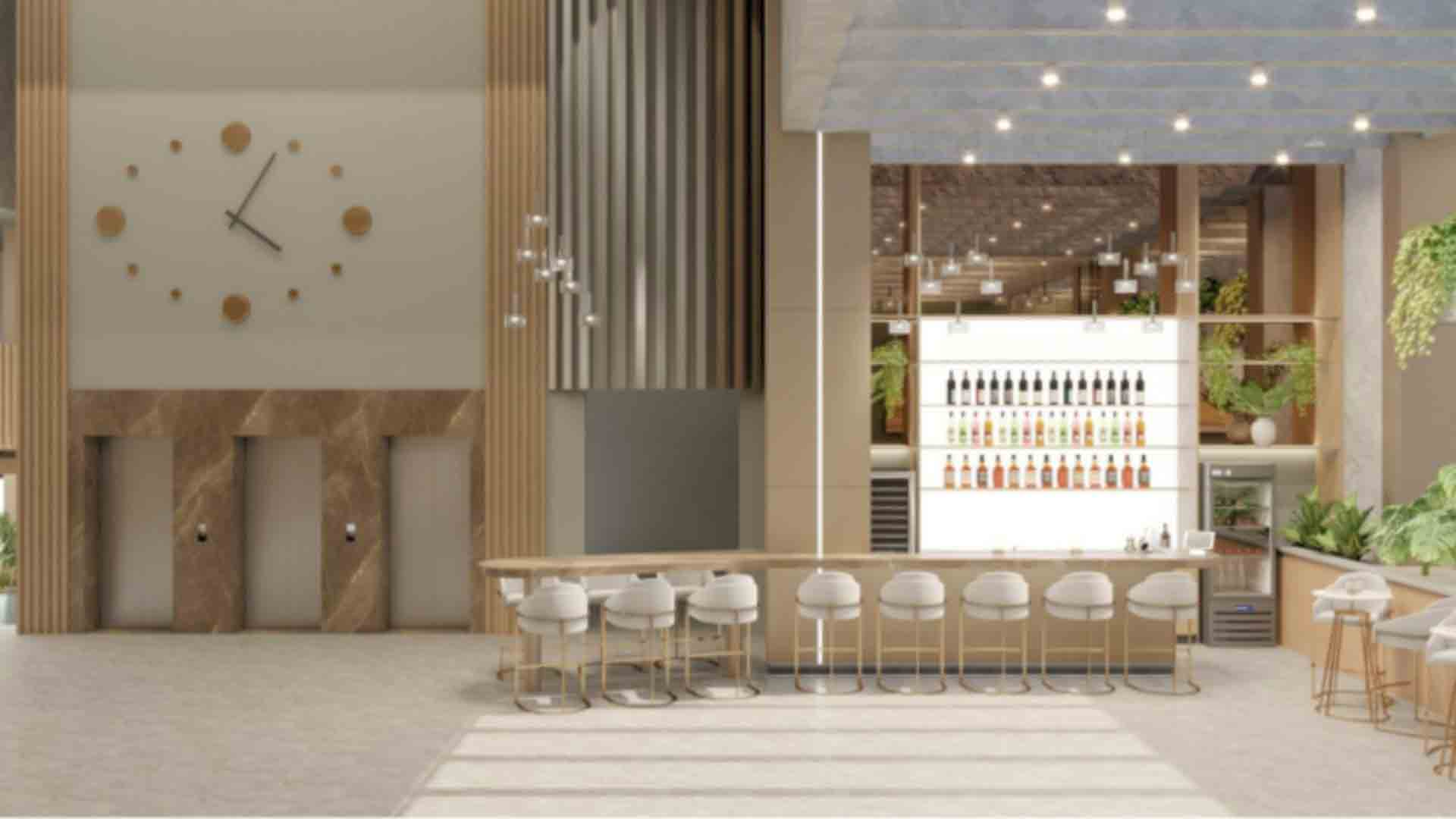 O hall de entrada tem escadarias, continuidade até a recepção dos tons em verde e madeira, lustres e móveis no lobby. Mármores devem dar destaque na bancada da recepção. Haverá um bar e área de espera, com móveis modernos, estilo “novelas e filmes”, com a adega repleta de bebidas e um balcão.