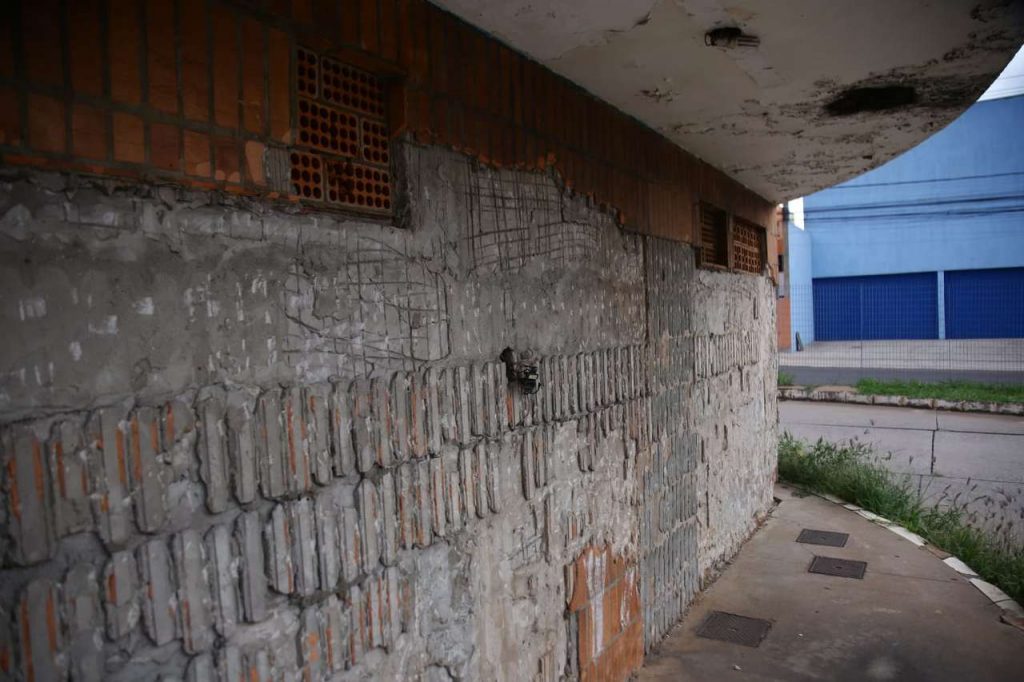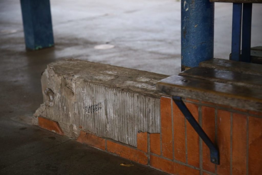 No solo, é possível ver o concreto cedendo e com diversas rachaduras. Ainda em relação à estrutura dos bancos, ele denuncia. “Aquele banco está quebrado há no mínimo oito meses”, disse o digitalizador.