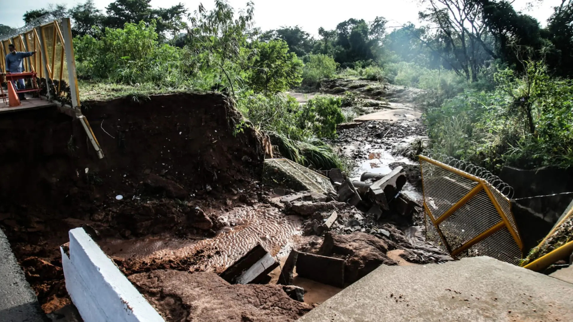 A chuva do dia 9 de maio deixou danos no Hospital São Julião, em Campo Grande. Parte da calçada e da cerca da entrada do hospital, caíram devido a força da água, que também danificou a tubulação.