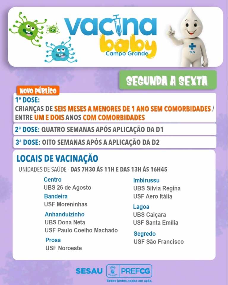 Segundo a Sesau (Secretaria Municipal de Saúde), o atendimento é das 7h30 às 16h45. É preciso estar atento porque a aplicação das vacinas infantis é feita em unidades