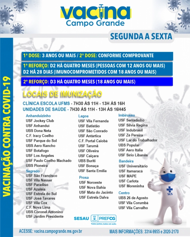 Principal arma contra casos graves e óbitos por covid-19, a vacina contra a doença segue disponível nas sete regiões de Campo Grande para moradores a partir dos seis meses de vida.