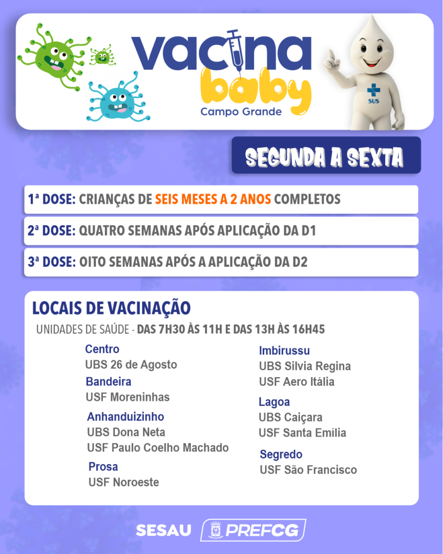 A vacina da covid-19 está disponível em mais de 50 locais de Campo Grande nesta sexta-feira (5). Segundo cronograma da Prefeitura, a aplicação, de primeira a quarta dose, está autorizada para moradores a partir dos seis meses de idade.