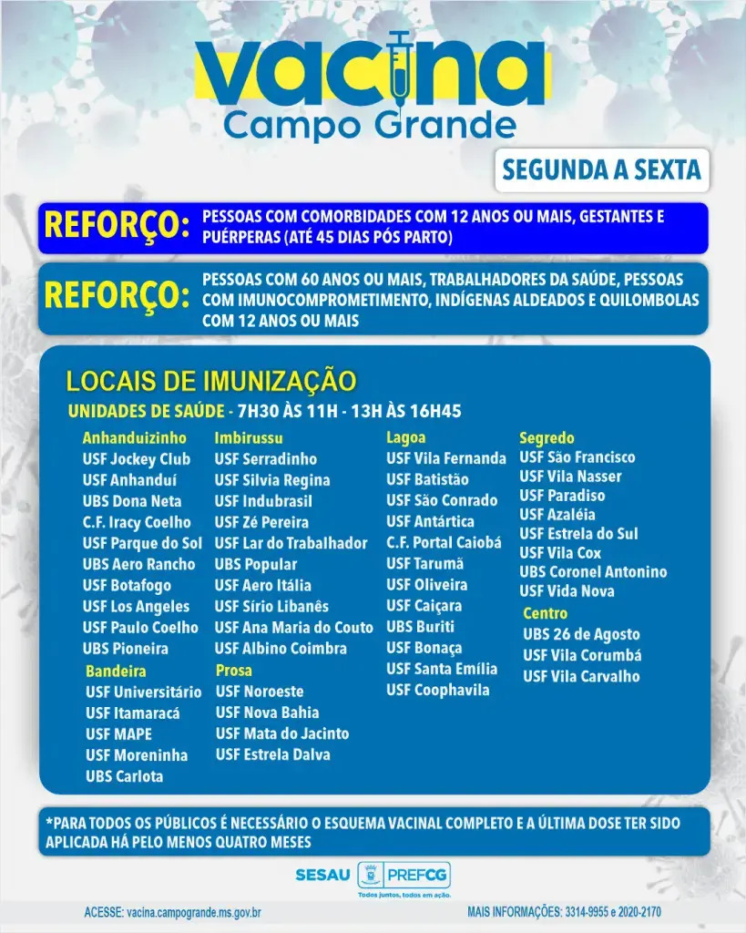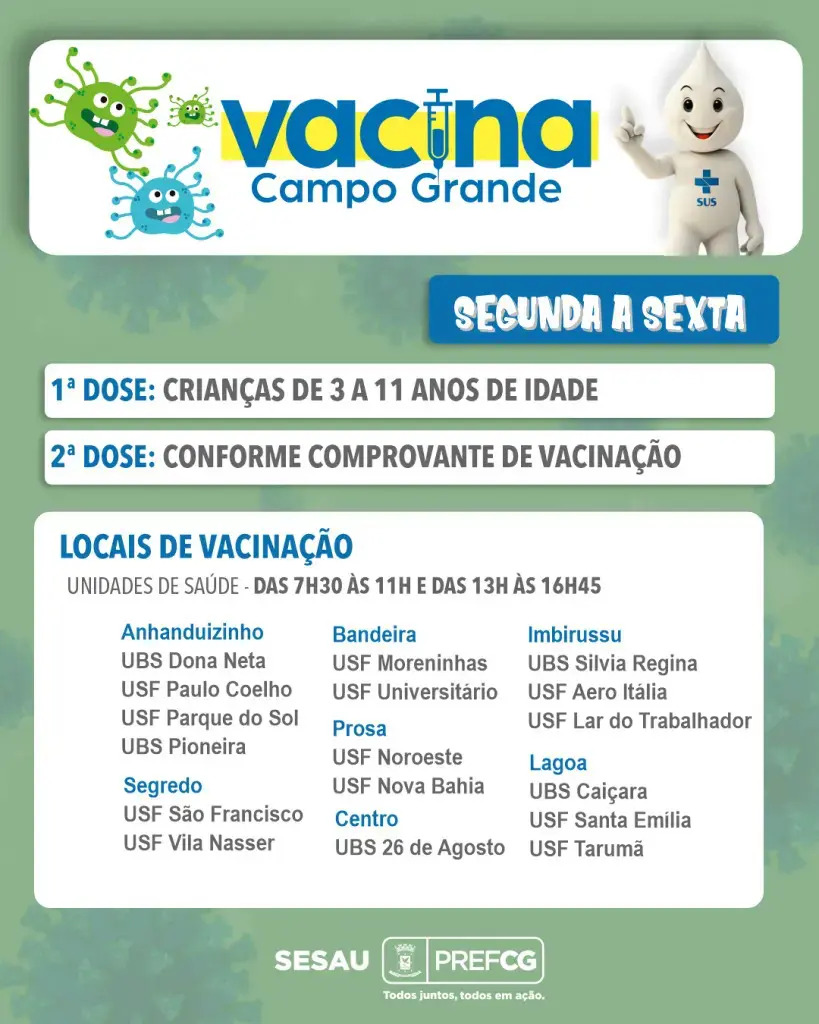 A vacinação contra a covid-19 continua em mais de 50 unidades de saúde de Campo Grande. Nesta terça-feira (25), o atendimento será das 7h30 às 16h45. A Sesau (Secretaria Municipal de Saúde) ampliou o calendário de vacinação e, agora, podem receber o imunizante crianças de seis meses a menores de 3 anos, sem comorbidades. A dose bivalente também está liberada para trabalhadores da saúde de qualquer idade.