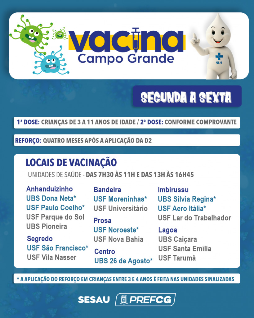 Conforme o cronograma, o atendimento começa às 7h30 e segue até 16h45. A aplicação do reforço em crianças entre 3 e 4 anos é feita em unidades sinalizadas, sendo na UBS (Unidade Básica de Saúde) Dona Neta, UBS 26 de agosto, UBS Silvia Regina, USF (Unidade de Saúde da Família) Moreninhas, Paulo Coelho, São Francisco, Noroeste e Aero Itália.