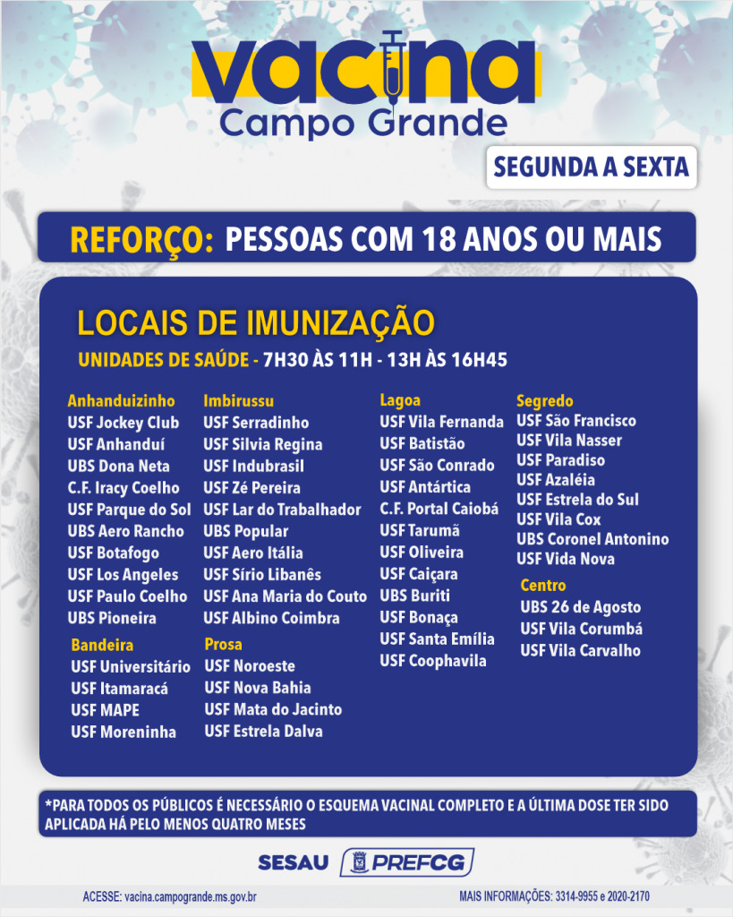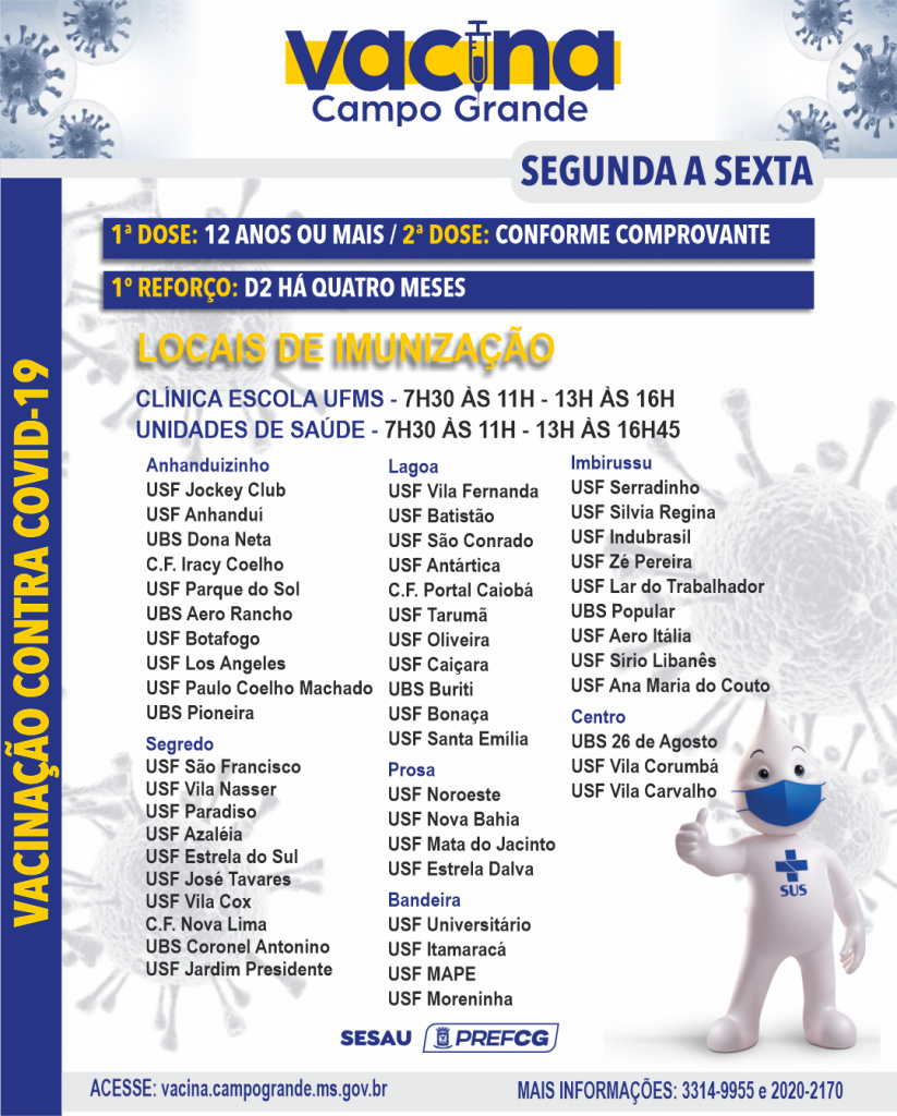 Em Campo Grande, a vacinação contra a gripe está disponível durante a manhã e tarde em mais de 70 unidades básicas e de saúde da família (UBSs e USFs) espalhadas pelas sete regiões urbanas e distritos do município.