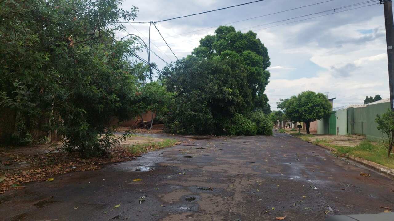 Na região do Santa Carmelia, uma árvore de grande porte caiu bloqueando totalmente a rua Jasmelinda Ferreira de Carvalho. Imagens enviadas por leitor do Jornal Midiamax mostram que a árvore foi arrancada pela raiz, mas não há informações de estragos causados.