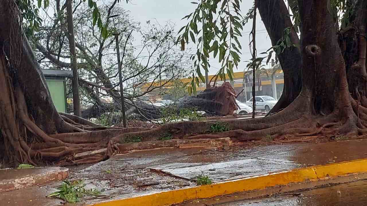 A chuva que atingiu Campo Grande nesta quinta-feira (19) durou cerca de 30 minutos, mas as imagens dos estragos deixados surpreendem. Várias árvores de grande porte foram arrancadas do chão com as raízes e o Cemtec/MS estima que ventos de 80 km/h tenham atingido o município.