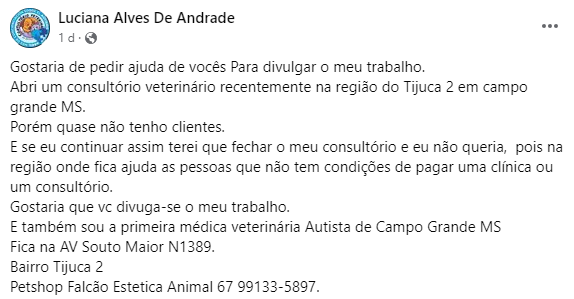 A médica veterinária Luciana Alves de Andrade, de 27 anos, chamou a atenção nas redes sociais com uma publicação procurando clientes para o consultório em que atende, na periferia de Campo Grande. Como ela recebe por comissão e o movimento está fraco, a profissional pede ajuda para divulgar o trabalho antes que seja forçada a encerrar o trabalho no local.
