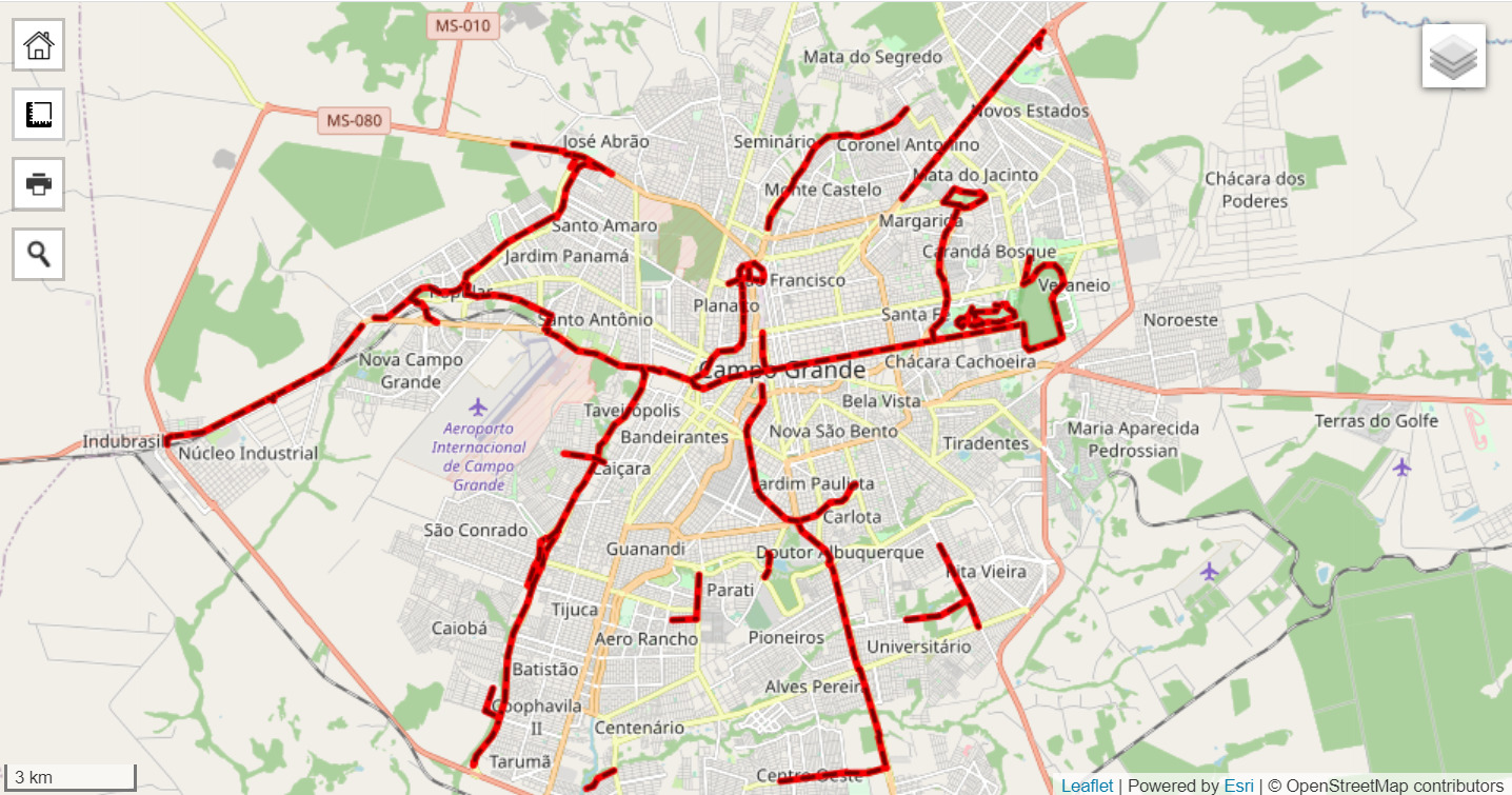 A visualização do Sisgran (Sistema Municipal de Indicadores de Campo Grande) mostra que essa infraestrutura é implementada em poucas avenidas que convergem para a região central.