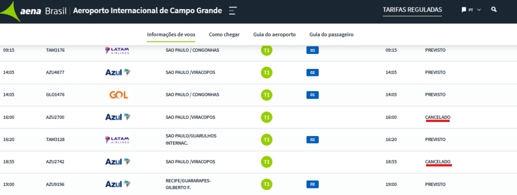 Um voo que sairia de Campo Grande para o Aeroporto Internacional de Cuiabá, às 05h, constava como previsto até a manhã desta terça-feira. Já outras duas aterrissagens em direção a Viracopos, às 16h e 18h55, aparecem como canceladas. Duas decolagens às 16h40 e 19h35, também para Viracopos, aparecem como canceladas.