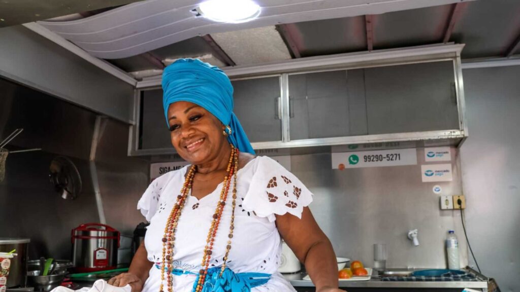 Sempre trabalha caracterizada pela tradição das baianas. “As baianas do acarajé são as primeiras mulheres negras empreendedoras do Brasil”, aponta.