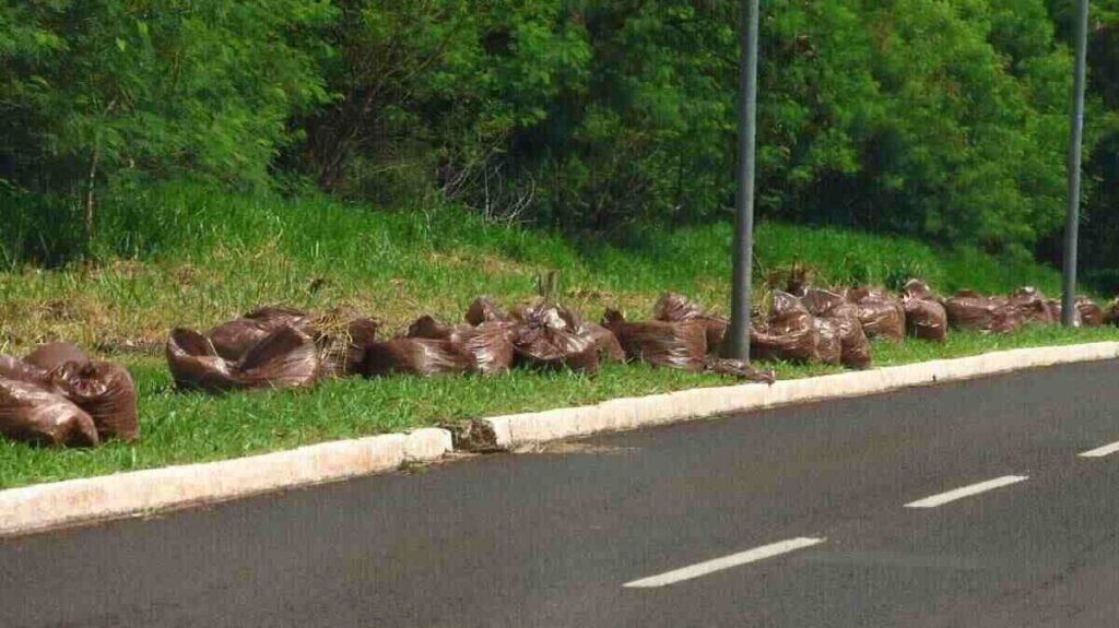 Moradores da região e condutores que andam pela avenida reclamaram da situação, que estaria ocorrendo há mais de uma semana. Os sacos foram utilizados para recolher resíduos de vegetação após o corte da grama e limpeza do local.