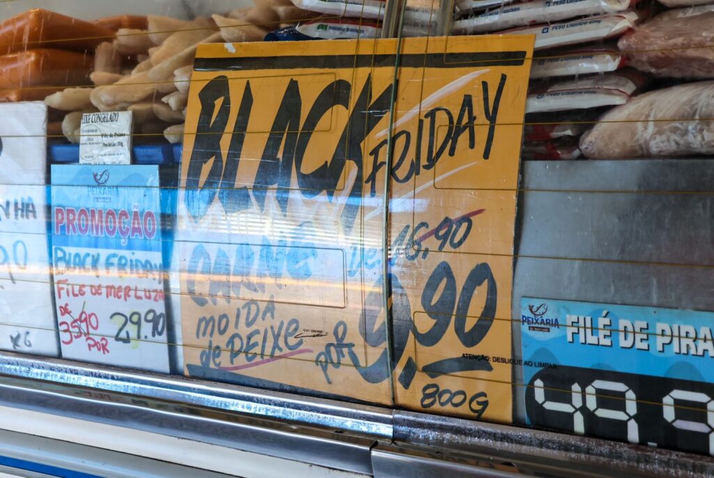 Black Friday de peixe? Tem também. Uma peixaria do Mercadão Municipal de Campo Grande aproveitou esta sexta-feira (29), dia de Black Friday, para oferecer produtos promocionais durante uma semana. Tem peixe com 50% de desconto e, além da peixaria, tem lojas e empresas aproveitando a data para vender alimentos e itens básicos.