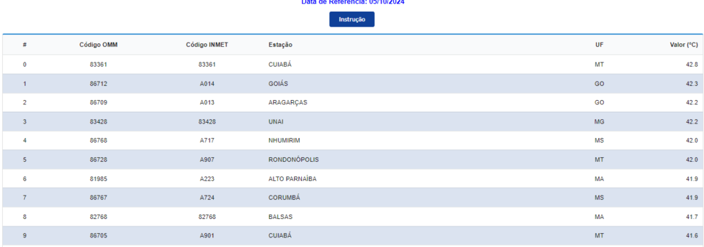 Segundo o Inmet (Instituto Nacional de Meteorologia), Nhumirim ocupa a 4ª posição no ranking, com calor de 42°C. Corumbá chegou a 41,9°C.