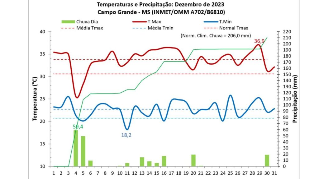 Segundo o Inmet, com média de 33,8°C, as temperaturas máximas fecharam o mês 3,2°C acima da média que é de 30,6°C para Campo Grande. Anteriormente, o recorde de temperatura para dezembro era de 32,8°C em 2002 (média mensal).