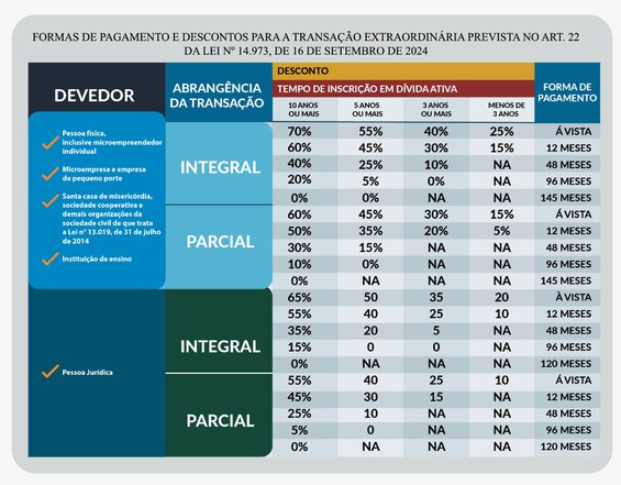 Para pessoas físicas, instituições de ensino, microempresas e empresas de pequeno porte, Santas Casas de Misericórdia, sociedades cooperativas e organizações da sociedade civil, os descontos vão de 10% a 70% e o parcelamento pode ser feito em até 145 meses.