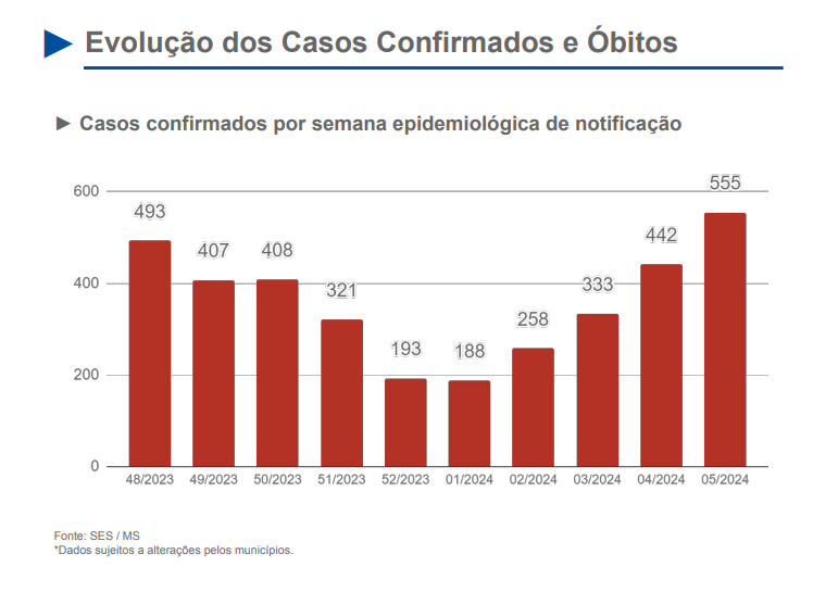 Os dados constam no boletim da SES-MS (Secretaria Estadual de Saúde), referente a quinta semana epidemiológica. A quantidade de casos novos cresceu 25,56%, saindo de 442 para 555 nos últimos sete dias.