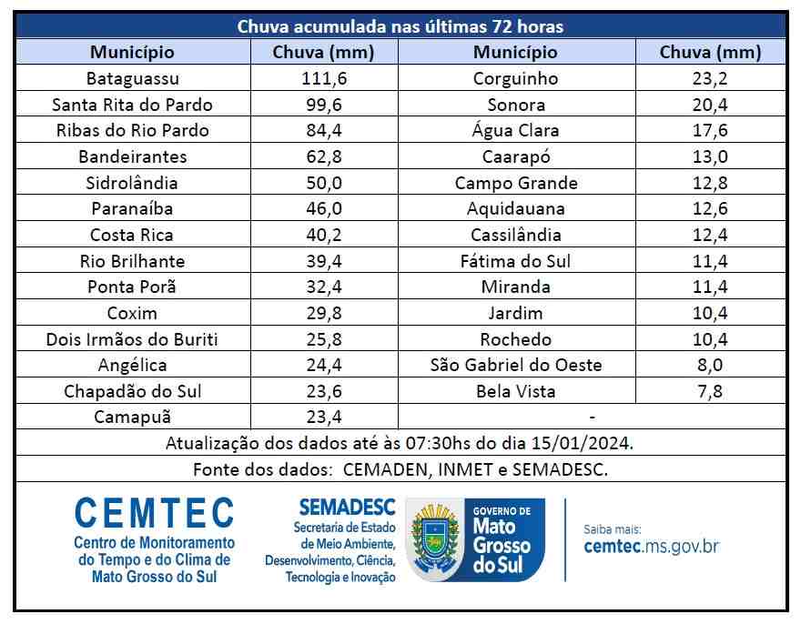 Bataguassu marcou volume considerável no período, com 111,6 milímetros. Em seguida, está Santa Rita do Pardo (99,6 mm), Ribas do Rio Pardo (84,4 mm), Bandeirantes (62,8 mm), Sidrolândia (50 mm) e Paranaíba.