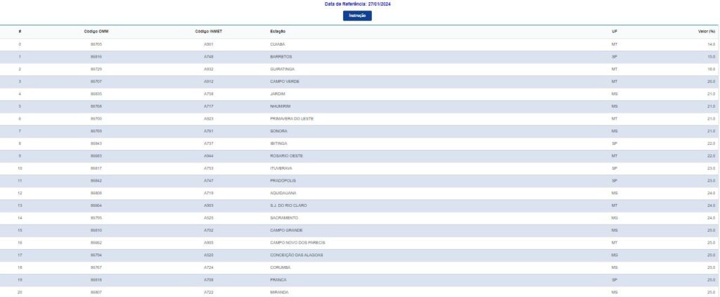 A região só perde para Cuiabá e Guiratinga, no Mato Grosso, e Barretos, em São Paulo, que marcaram umidade entre 14 e 18%.