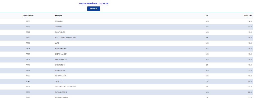 Quanto os municípios de menor umidade relativa do ar, o Estado ocupa as 10 entre as mais secas, com nível de alerta entre 14 e 20%. Amambai está na 1ª posição do ranking, em seguida Jardim (14%), Dourados (16%), Juti (18%), Ponta Porã (18%), Sidrolândia (18%), Três Lagoas (18%), Maracaju (19%) e Água Clara (19%).
