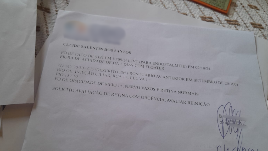 Com encaminhamento em mãos, Cleide buscou a Santa Casa, sem sucesso. “Cheguei lá em um plantão de sábado. O médico que estava de plantão falou: ‘não sei o que fizeram no seu olho. Se você quiser aguardar, vou tentar entrar em contato com a sua doutora para ver qual procedimento foi feito. Não posso fazer nada”, conta.