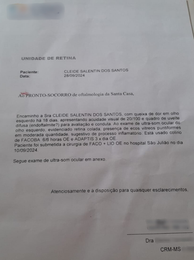 Documentos enviados pela autônoma ao Jornal Midiamax mostram que a solicitação de cirurgia foi feita em 14 de novembro de 2023. O procedimento, no entanto, foi realizado no dia 10 de setembro de 2024, no Hospital São Julião, referência em cirurgias oftalmológicas na Capital.
