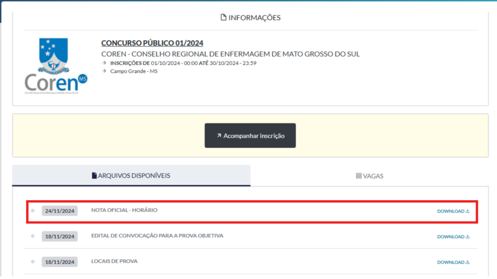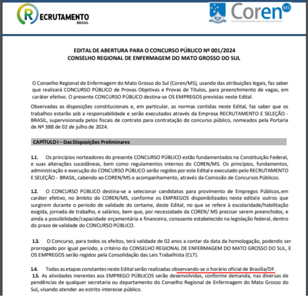 Entretanto, neste domingo um novo arquivo foi disponibilizado no site da banca informando que a prova do Concurso Público 01/2024, do Coren-MS, seria realizada no “horário oficial do estado de Mato Grosso (horário de Cuiabá).”