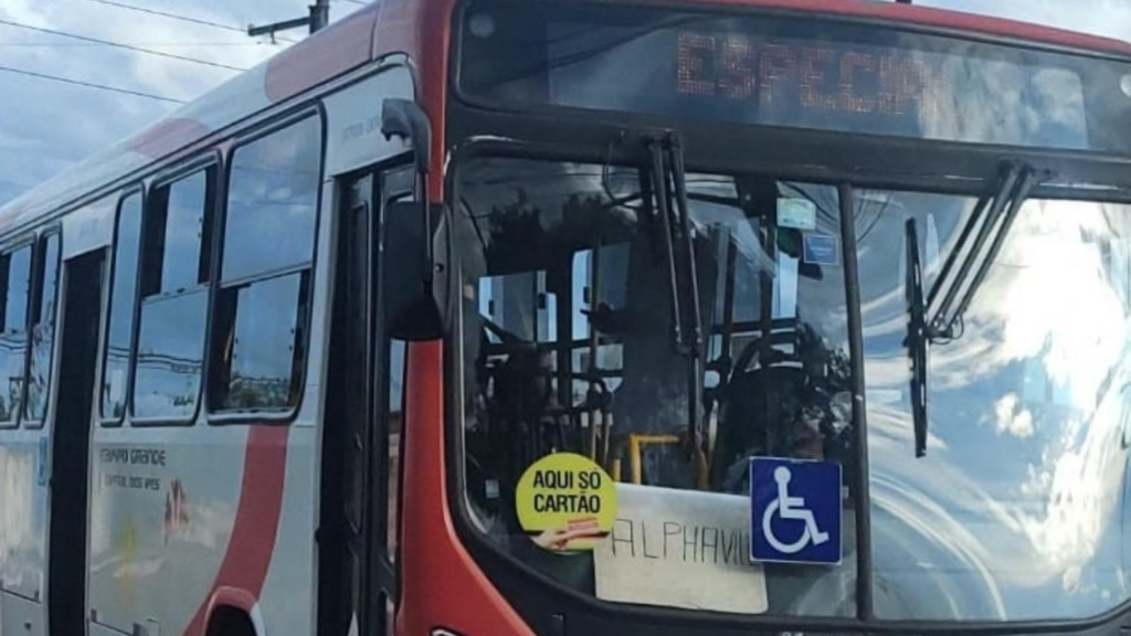De maneira improvisada, um ônibus circula com a placa escrita à mão dizendo “Alphaville”. Nas fotos, é possível perceber que algumas placas estão inclinadas ou semicobertas por adesivos, o que deve dificultar mais a identificação da linha.