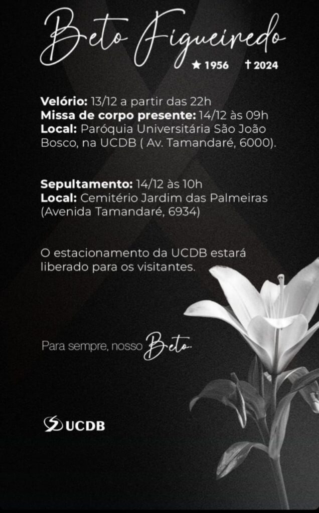 Corpo do ex-superintendente da Cultura e professor universitário, Roberto Figueiredo, de 63 anos, será velado a partir das 22 horas desta sexta-feira (13) na Paróquia UCDB, em Campo Grande. A missa de corpo presente acontece às 9h deste sábado (14) e o sepultamento logo depois, às 10h. O professor foi assassinado por um adolescente, de 17 anos, na madrugada desta sexta, na casa da vítima, Paróquia UCDB. Roberto ainda chegou a lutar com o autor, antes de ser morto.