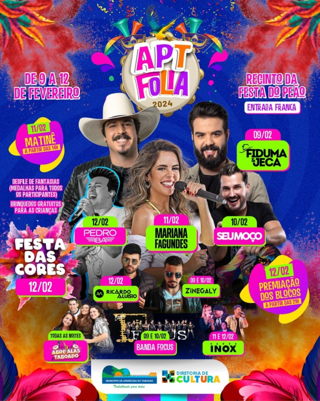 A APT Folia prevê festa entre 9 e 12 de fevereiro, no Recinto da Festa do Peão, com entrada franca. Estão previstos vários ritmos para agradar todos os gostos como marchinhas, pisadinha, axé, sertanejo, funk, entre outros.