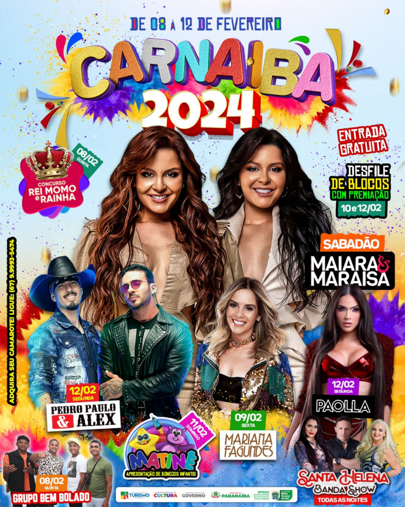 Carnaíba deve agitar o carnaval em Paranaíba com cinco dias de festa, entre 8 a 12 de fevereiro. Um dos destaques da programação é a apresentação da dupla Maiara & Maraísa, concurso de blocos, de Rei Momo e Rainha. A Banda Santa Helena fará apresentação todas as noites no palco do Carnaíba.