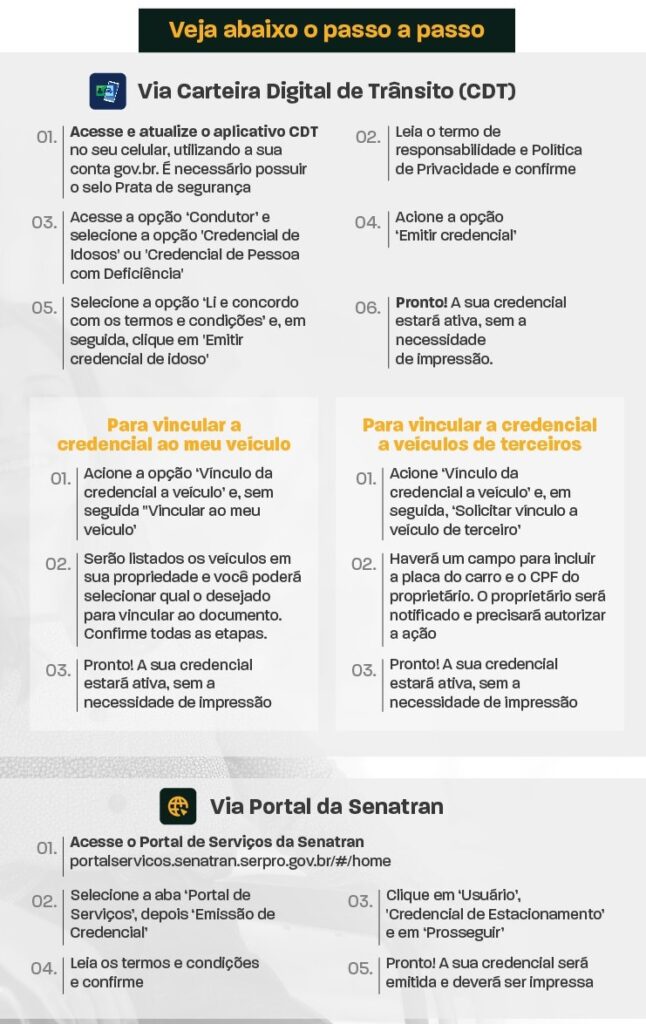 A credencial pode ser solicitada pelo Portal de Serviços Senatran e pelo aplicativo da Carteira Digital de Trânsito.