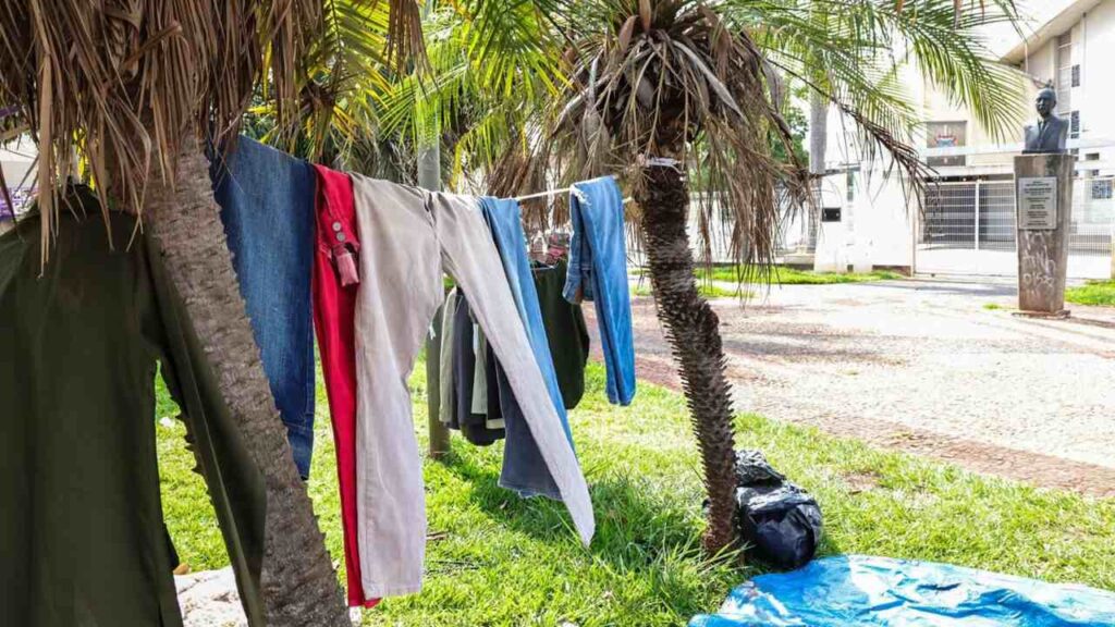 “Aqui eu converso com todo mundo. Me chamam de vó, compram roupa”, conta Bete, que vasculhas brechós de bairros para achar peças com preço bom e poder revender no centro. A ideia dela é justamente ajudar pessoas em situação de rua ou vulneráveis economicamente.