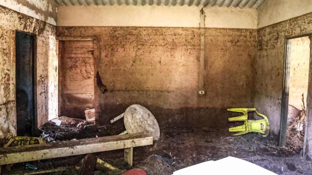 O sofá, que antes acolhia os moradores, está irreconhecível, misturado a pedaços de madeira e galhos trazidos pela força da água e lama. O cheiro forte de material em decomposição domina o espaço, tornando o ar quase irrespirável. Nesse ambiente, o silêncio reflete a ausência de vida.