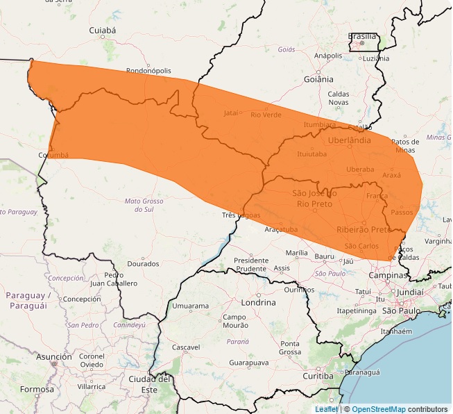 O alerta laranja vale para cerca de 25 cidades do Leste, Centro-Norte e Pantanais do Estado. Além de MS, os estados de Minas Gerais, São Paulo, Goiás e Mato Grosso também estão sob alerta.