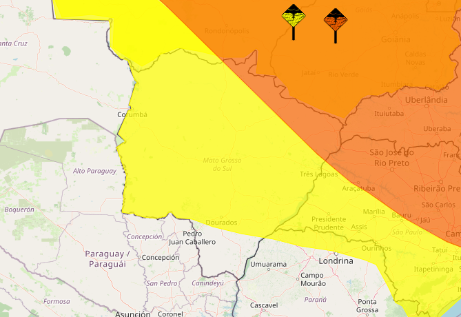 Já o segundo aviso é de perigo, nível laranja, válido também até a manhã de sábado para Água Clara, Alcinópolis, Aparecida do Taboado, Cassilândia, Chapadão do Sul, Costa Rica, Figueirão, Inocência, Paraíso das Águas, Paranaíba, Pedro Gomes, Selvíria, Sonora e Três Lagoas.